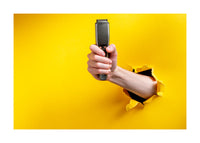 Photograph of an electric shaver being shoved through yellow paper - perhaps indicating it is time to shave